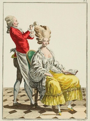 M.A.- Per realizzare i miei pouf ci vogliono ore e ore di lavoro, mon cherì: è molto complesso. Il mio coiffeur, Lèonard, prima mi unge il capo con pomate naturali, poi inizia a creare l’impalcatura: costruisce la struttura con un telaio metallico e poi un’imbottitura con dei cuscini. Inizia quindi ad acconciarmi i capelli naturali e poi ne inserisce altri posticci, beh… molti altri, fino a raggiungere altezze incredibili: mezzo metro come minimo. Sapete, una volta hanno dovuto smontare la mia acconciatura perché non passavo dalla porta… Quando ha finito con boccoli e cotonature, inizia ad inserire nastri, diamanti e poi, in cima, quello che richiede l’occasione: frutta, fiori, piume, paesaggi, case… ho persino indossato un veliero!