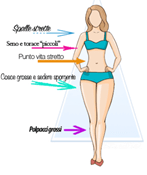 Parte superiore del corpo meno rilevante rispetto a quello inferiore, dove sono presenti fianchi prosperosi. Per questa fisicità è consigliato indossare pantaloni o gonne larghe dal taglio dritto e arricchire la parte superiore del corpo con accessori come collane e orecchini appariscenti. Le spalle possono essere messe in risalto con le giacche con all’interno le spalline.